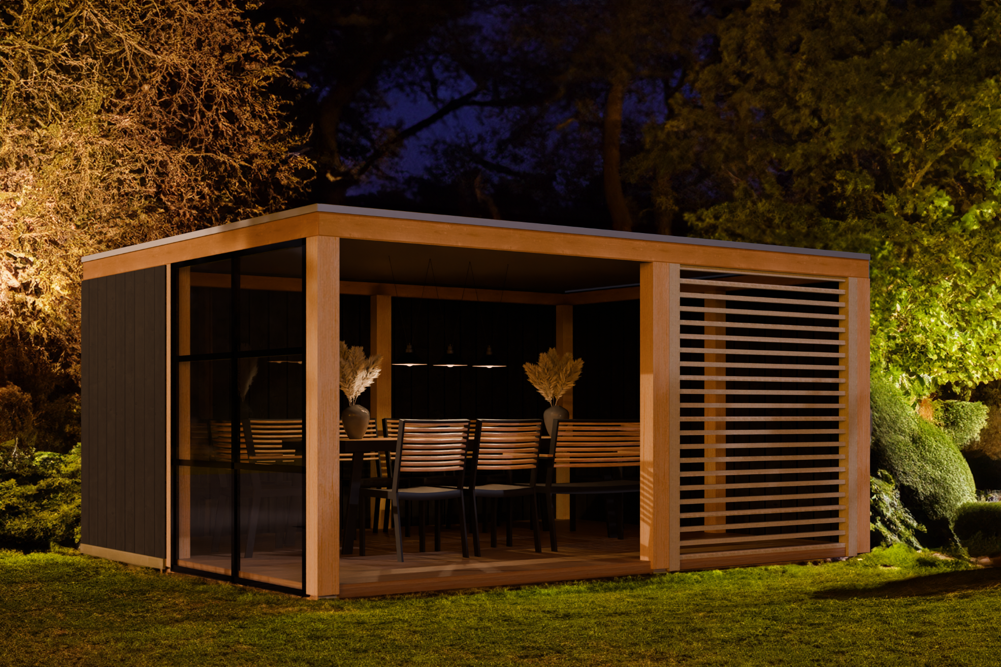 Het unieke PSM8 tuinhuis, gemaakt met het gelicenseerde Pro systeem van Lugarde, maakt indruk met zijn Scandinavische vurenhout met steiger-look. De steiger-look geeft het gebouw een rustieke charme, met een ruw oppervlak dat doet denken aan de structuur van steigers. Ontworpen als open tuinkamer is de voorkant relatief open, met de lamellenwand die zorgt voor zacht licht en bescherming tegen de zon. Eén kant van de tuinkamer is afgesloten met de vaste glazen wand in een trendy steel-look, terwijl de achterwand van de tuinkamer gemaakt is van Scandinavisch vurenhout. Je kunt de vloer optioneel toevoegen. Het ontwerp wordt afgerond door een plat dak met duurzame EPDM folie, wat het PSM8 tuinhuis een eigentijdse en stijlvolle afwerking geeft.