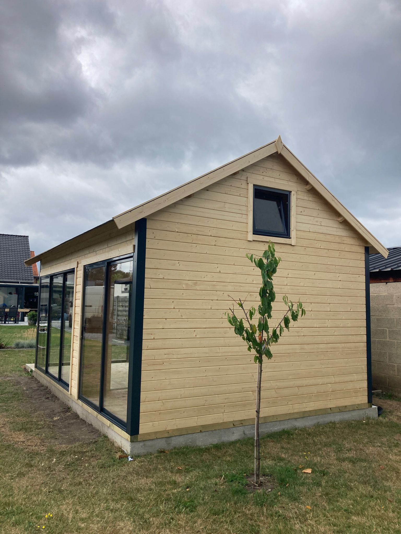 Nieuw goedkoop modern tuinhuis met plat dak te koop en gratis thuislevering door goedkooptuinhuis.
